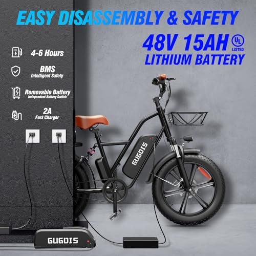 • 60 Miles Range & UL Certified : GugoIs electric mountain bike is equipped with a 48V 15AH high-capacity removable battery, which gives you a maximum range of 30 to 60 miles! The removable battery of this fat tyres electric bicycle is UL2849 certified and effectively protected by BMS.It is important to ensure the safety and stability of the battery. We’re committed to ensuring that everyone enjoy a safe and enjoyable ride