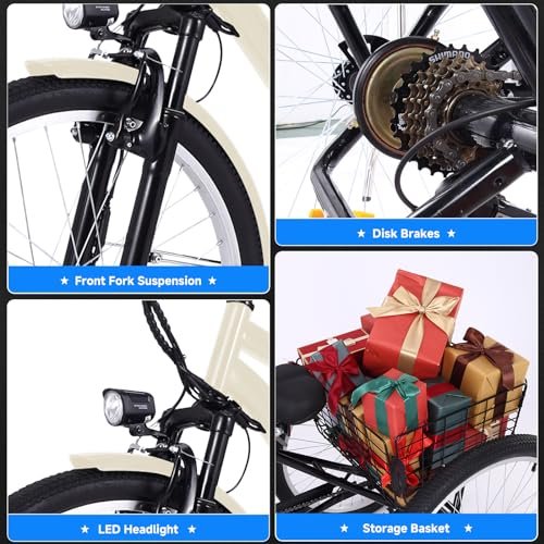 26 Inch 24 Inch Adult Electric Tricycle 3 Wheel Mountain Electric Bicycle with Basket, 350W Brushless Motor, 36V 10Ah Removable Battery, 7 Speed Ebike Trike for Men Women