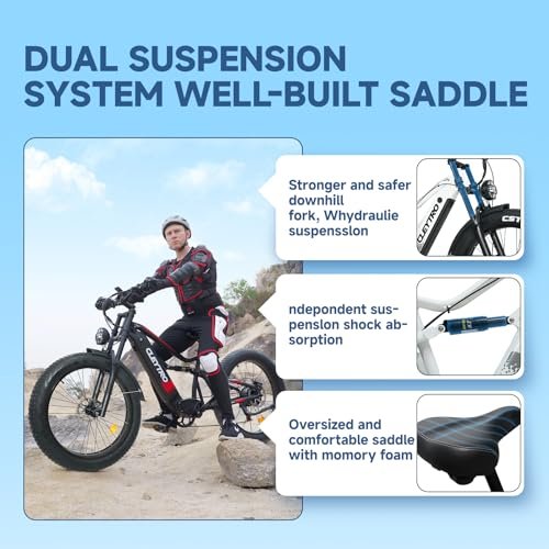 • ????【Full Suspension & Hydraulic Disc Brakes】The mountain electric bike is equipped with front and rear hydraulic disc brakes, double shoulder front suspension downhill fork and rear suspension, and 26-inch fat tires to improve your riding comfort, control and Safety.