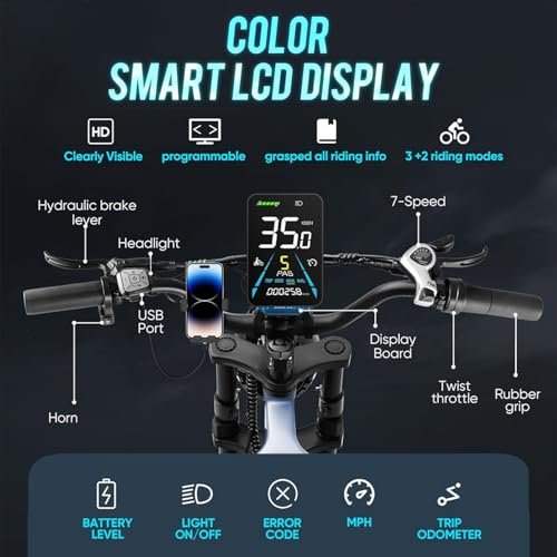 • 【????????Upgraded eAhora Juliet Electric Bike????????】①Peak 1200W motor,②60Ah ultra large battery,③Adjustable front fork,④Dual rear rack,⑤360° Full lighting system,⑥Wider seat,⑦Dual 4- position hydraulic brakes,⑧Color display with passward,⑨Integrated electronic control system,⑩8Ah charger