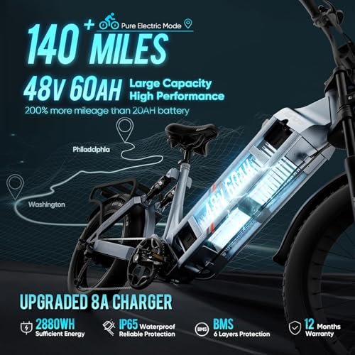 • 【????????48V 60AH Long Range Electric Bike????????】➤The 60Ah automotive grade high-capacity battery is 3 times larger than the 20Ah ordinary battery capacity, which means that the range of this long range electric bike equipped with a 60AH battery capacity will never disappoint you. ➤You only need to charge eAhora Juliet electric bike with the equipped fast charger for 6-8h, and then you can ride it for a whole day. The range is up to 140+miles.