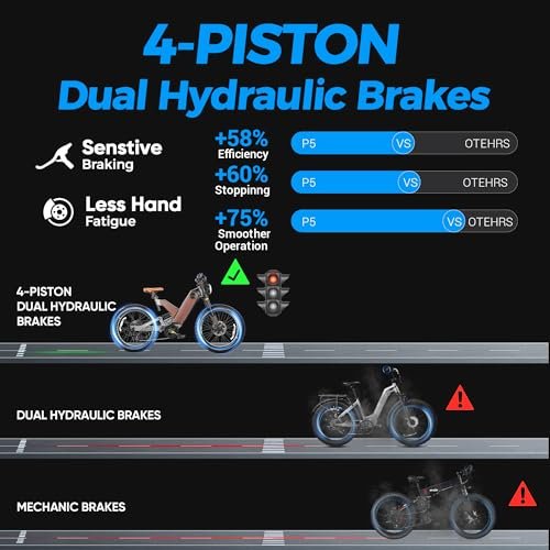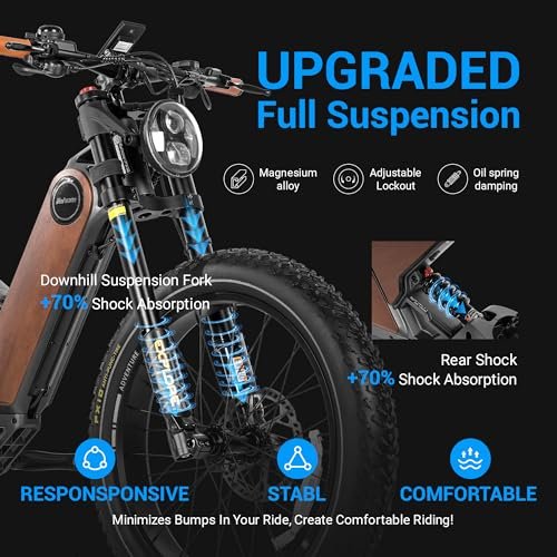 • 【????More Stable Full Suspension & Safe Braking】①Full suspension e-bike has adjustable and lockable perfect aluminum shoulder fork, with a shock absorption stroke of 100mm, and an adjustable oil spring rear suspension of 1200 pounds with a travel of 30mm.It can help you overall reduce joint stress and additionally reduce hip joint damage.②Upgraded 4-position hydraulic brake has increased efficiency by 58% and stopping power by 60%, and operation has become smoother.