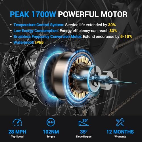 • 【????Peak 1700W Powerful Motor】Peak 1700W high-speed motor provides eAhora electric bike max speed up to 28-32 mph, having a very strong and efficient cycling experience. 102Nm of torque offers strong climbing power. Cyclists can easily conquer the most rugged terrains.