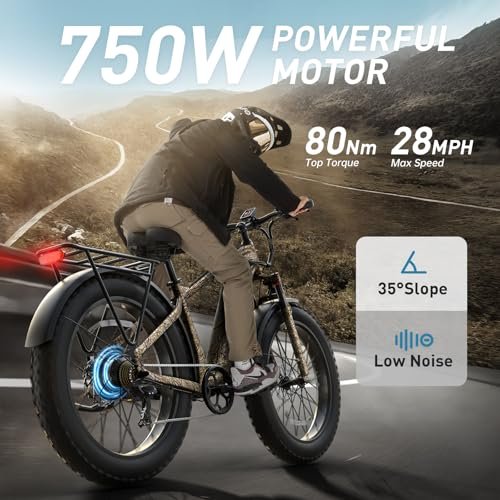 Electric Bike for Adults, 26″ Fat Tire Electric Mountain Bike with 750W, 48V 15AH Removable Battery Ebike, 28MPH Aluminum Frame E Bike with 7-Speed and Front Suspension Beagle