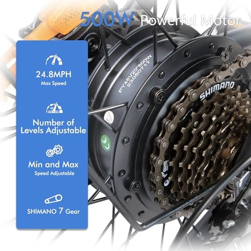 • 【SAFETY SYSTEM】: 1. SHIMANO 7-speed transmission system change system allows you to switch between various speeds smoothly. 2. Aluminum front fork suspension makes the biking smooth and comfortable. 3. LED integrated headlight and taillight the way for you and alert other. (Taillight come on when braking) 4.The electronic horn allows you to alert pedestrians or vehicles in front of you while riding.