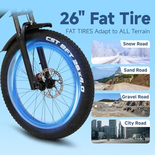 ????♀️【26 X 4-INCH FAT TIRES】The mountain electric bike is equipped with 26x 4-inch fat tires, which can travel through various terrains, including mountains, snow, beaches, cities, and jungles. Dual shock absorbers front and rear reduce bumps on rough roads. Dual hydraulic disc brakes provide excellent stability and safety.