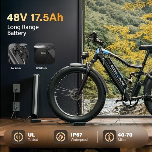 • 【17.5Ah Large Battery with Extra USB Ports】Electric bicycle is equipped with a 17.5Ah 48V lithium-ion battery, which provides the bike with 40+ throttle miles and 70+ pedal miles. Battery is removable and IP67 waterproof, convenient to bike anywhere safely. Except for the charging port of phone holder, we added an extra usb ports on the battery, providing more charging option.