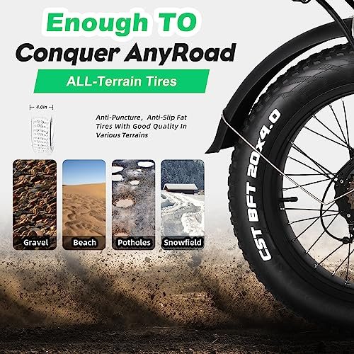 • ????【4″ FAT TIRES ELECTRIC BIKE & SHOCK ABSORBER】2023 Upgrade 4″ wide wear-resistant fat tires ebikes have better performance and a cooler appearance. With excellent suspension front fork and Seat Post. In addition to city roads, this fat tire ebike can ride on snow, beaches, rugged mountain roads, and even urban jungles.