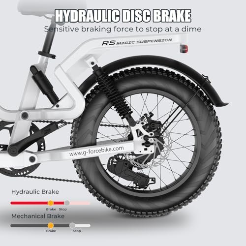 • 【REDUCE 90% OF ROAD DUMPS】Reduce 90% of road bumps with G-FORCE’s exclusive design! Our magic suspension includes 2 adjustable front fork shocks and 4 frame link shocks, offering an unprecedented silky smooth cycling experience. Perfect for daily commuting, cruising around town, and wild exploration!
