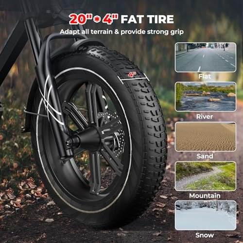 • 【SMOOTH RIDING EXPERIENCE】: This adult electric bike has 20″x4″ fat tires which can provide a strong grip for all-terrain like snow, mountain, sand & city roads. Adjustable full suspension & extra large seat could absorb 60% of road bumps & provide a stable riding experience no matter where you go;