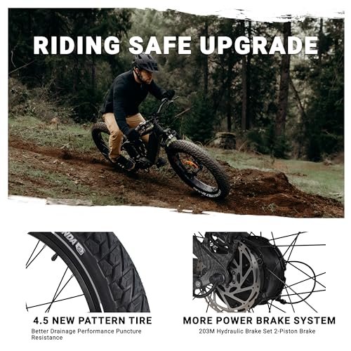 • 【Adventure Without Compromise】Adventure shouldn’t mean compromising on safety. The D7 upgrades to a larger 203mm front brake disc, providing you with stronger stopping power. The dual 4.5-inch fat tires offer improved braking, water dispersion, and puncture resistance. The innovative one-finger operation ensures focused and safe mountain biking.