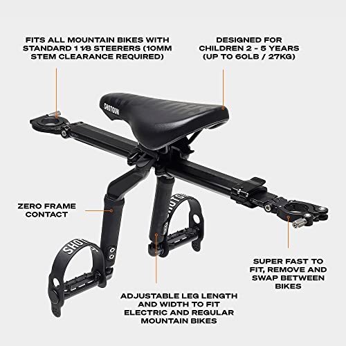 • Are You Raising a Future Mountain Biker? Shotgun Child Bike Seat and Handlebars Combo The Shotgun combo is the ultimate setup for your mountain bike kid. ABOUT THE SHOTGUN 2.0 SEAT AND 2.0 HANDLEBARS COMBO: Front mounted child seat for kids 2 – 5 years (up to 27kg or 60lb) Full rubber protection (for alloy or carbon frames) Adjustable width and angle to fit all mountain bikes Quick release fitting for easy installation and removal Kids 2.0 bars fit 25.4mm, 31.8mm and 35mm handlebar diameters. With the Shotgun 2.0 Seat and 2.0 Handlebars Combo, you can foster a love for the outdoors and share your passion for mountain biking with your child aged 2-5 years (up to 60lbs). The Shotgun Seat is designed to attach to the front of your bike, letting your child ride up front with you for the real mountain biking experience.Shotgun Handlebars are designed to attach to the front of your MTB so that your child has their own comfy handlebars when riding the Shotgun Seat, rather than sharing yours. Fits All Mountain Bikes The Shotgun Handlebar attachment fits flat and riser style handlebars. They come with inserts to fit 25.4mm, 31.8mm and 35mm handlebar diameters. The Shotgun Seat fits all adult mountain bikes including both flat and sloping top tubes. Any questions about your bike compatibility – just send us a message! Easy to Fit and Remove There are no special tools required and the Shotgun Handlebars come with detailed fitting instructions and great customer support. The quick release attachment makes the Shotgun Seat easy to install and remove when not in use. Comes with detailed fitting instructions and customer support Click ADD TO CART now and open up a whole new world of adventure with your kids!