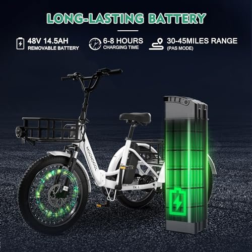 【REMOVABLE BATTERY】The Electric Tricycle is equipped with a 48V 14.5Ah removable battery, which can travel 35-45 miles on a full charge. You will experience longer cycling time and the flexibility to charge during the journey.