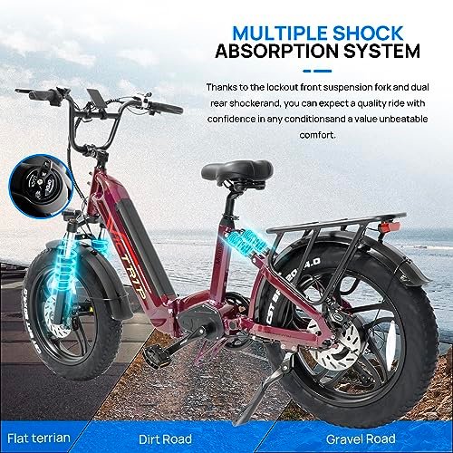 • 【PATENTED DESIGN】:The foldable design is easy to carry and space-saving, Its compact size makes it easy to store in your trunk, RV. enjoy the freedom to explore new places. The Step-Thru design is easy to get on and off for Riders of All Ages and Abilities! The professional design of the rear dual shock absorbers not only reduces the height of the seat so that more people can experience the fun of the dual shock absorbers. It also avoids the shock absorbers from pinching clothes when crossing.