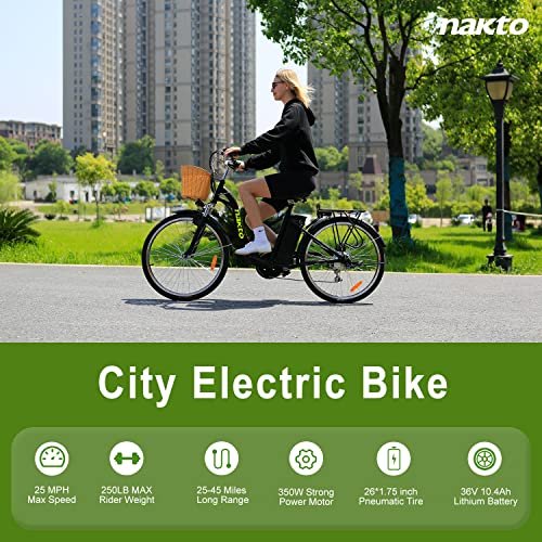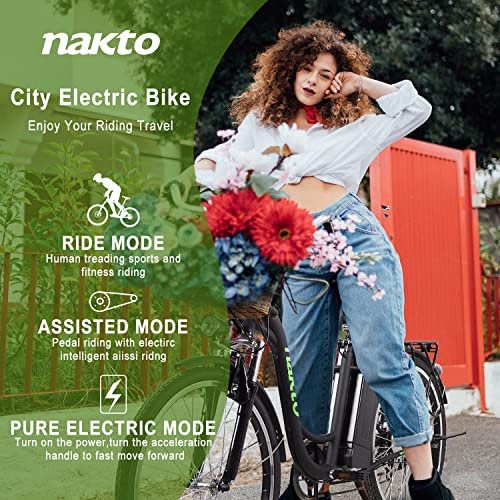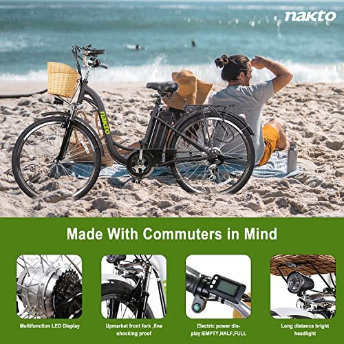 NAKTO Electric Bike for Adults 26″ 250/350W Electric Bicycle for Man and Women with High Speed Brushless Gear Motor 6-Speed Gear Speed E-bike with Removable Waterproof 36V10A/12A Battery
