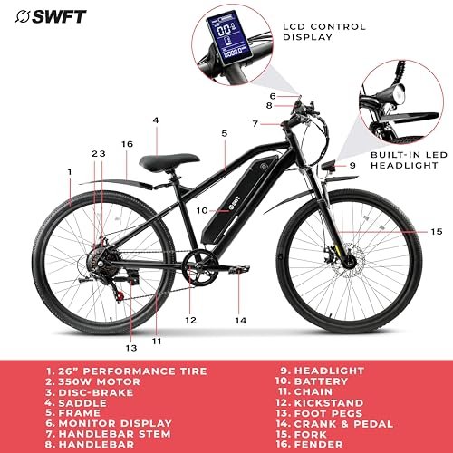 • Introducing the SWFT Edge Electric Bicycle: fast, strong, and versatile, designed for multi-use riders. From streets to trails, it features high-tread tires and disc brakes for enhanced stopping power. With a 350W motor and 36V 7.5AH battery, it offers up to 44 miles of adventure at speeds of up to 20MPH on a single charge. The removable rechargeable battery fully charges in just 4.5 hours and boasts a 500-cycle lifespan. Monitor your ride with the premium LCD display, which tracks speed, throttle, light, and battery level, while the built-in headlight ensures visibility for safe riding day or night. With 3 pedal assist modes, reaching top speeds is effortless, offering different levels of assistance for various riding conditions.