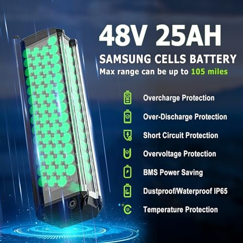【48V 25AH Battery & 105 Miles Max Range】: Hidden removable 48V 25Ah battery with international brand cells to ensure using safety; 54V 3A charger for 4-6 hours of fast charging for up to 60-105miles of range (NOTE: in pedal assist mode) The aileage range varies according to road condition, riding mode, weather, rider’s weight, battery power value etc