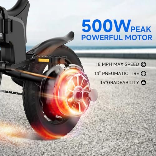 Efficient Performance: The folding electric bike is equipped with a powerful brushless motor with a peak power of 500W, giving the e-bike a top speed of 18 mph. The 36V 7.8AHA lithium battery provides up to 18 miles of battery life, providing enough power for daily commuting, outdoor sports, and vacation camping.