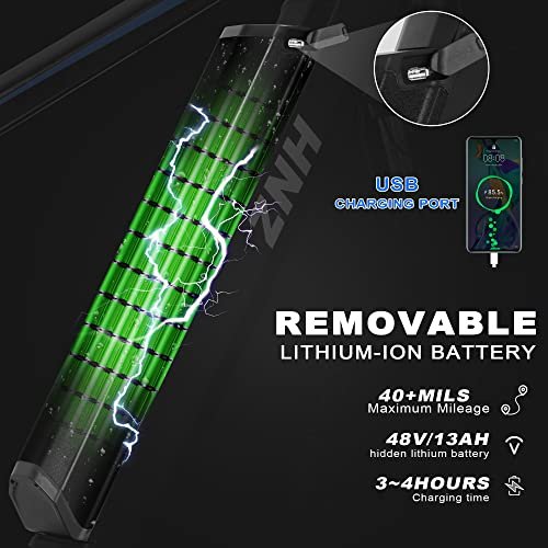 • 【large-capacity battery 】 equipped with a 48v 13ah larger battery, which can greatly increase the service life, in addition, this battery has a usb port, which can be used for charging other devices, which is more user-friendly, ebike provides a longer ride for the journey range, up to 40+ miles on a full charge. the battery is lockable to prevent theft and removable for charging.